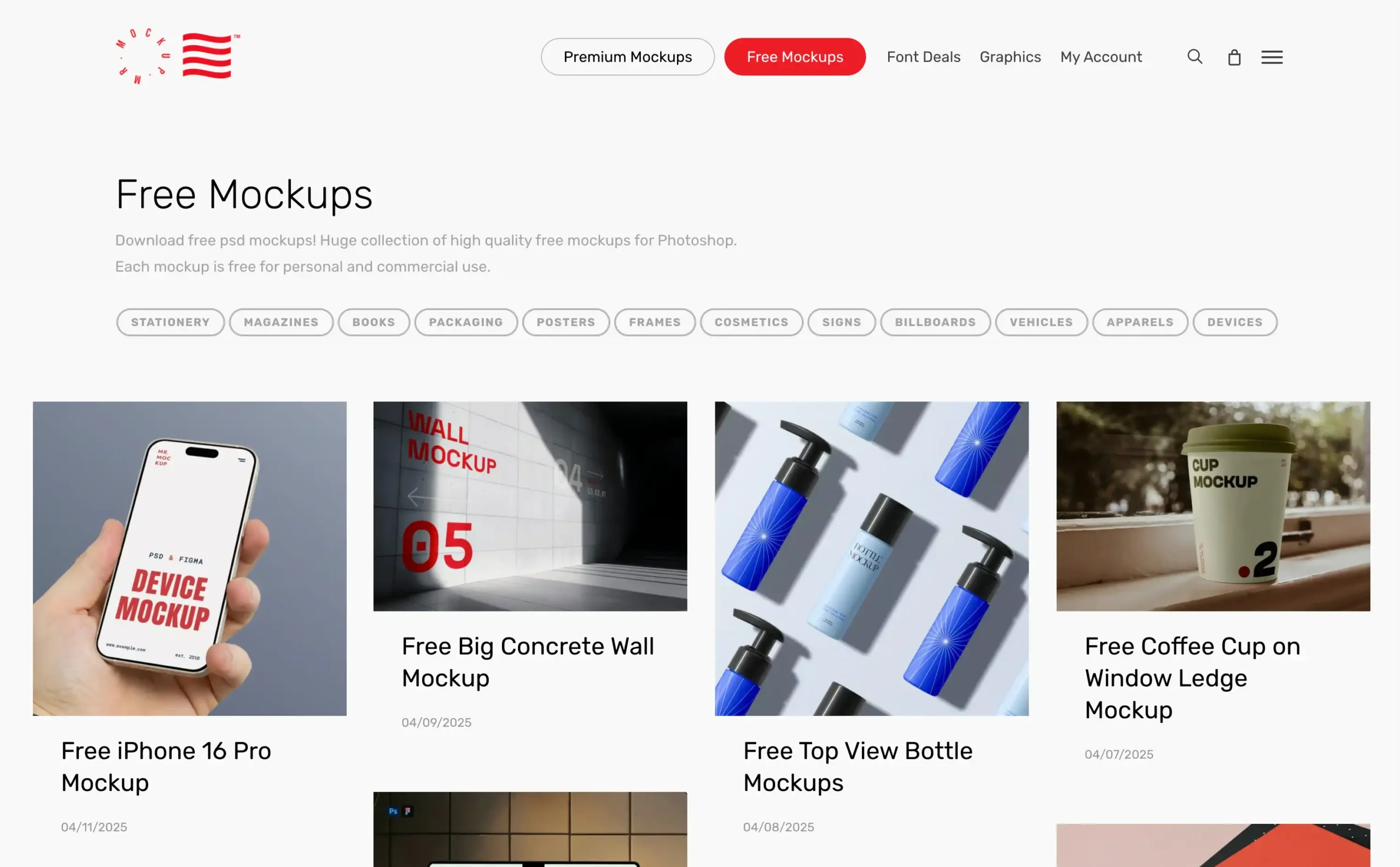 Mr.Mockup’s “Free Mockups” section is a large gallery of downloadable PSD mockup files for Photoshop, aimed at helping designers showcase branding, packaging, print, digital, and product designs in realistic settings. The page organizes hundreds of free mockups into categories such as stationery, magazines, books, packaging, posters, frames, cosmetics, signs, billboards, vehicles, apparels, and devices, with each item presented as a thumbnail, title, short description, and detail page containing the PSD download link. All listed freebies are marked as free for both personal and commercial use, positioning the section as a long-running, regularly updated resource—new items such as label, cosmetic bottle, and banner mockups are still being added.