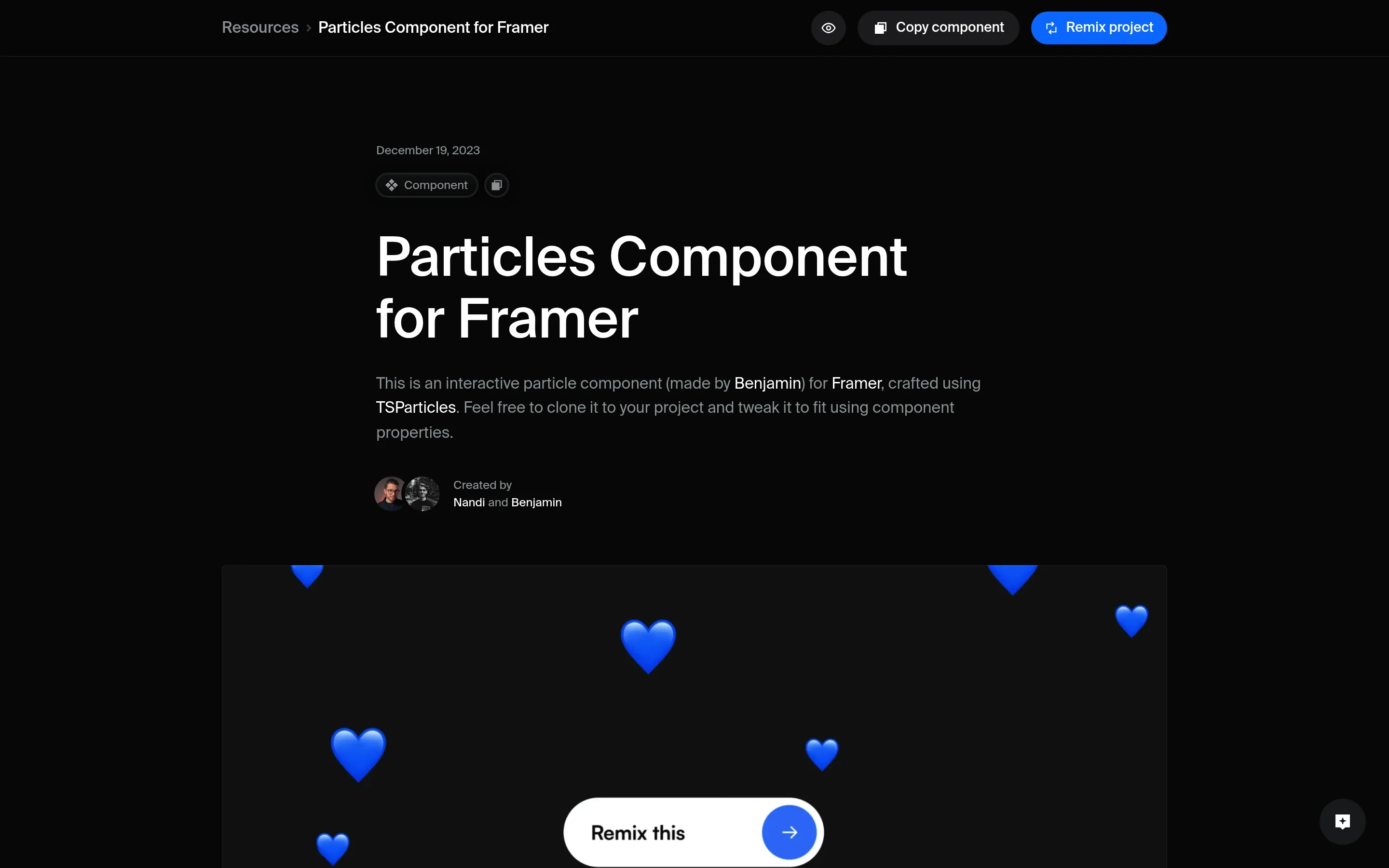 Framer University provides this component as a ready-to-use resource, enabling users to remix, experiment with different settings, and incorporate animated particles into their designs.