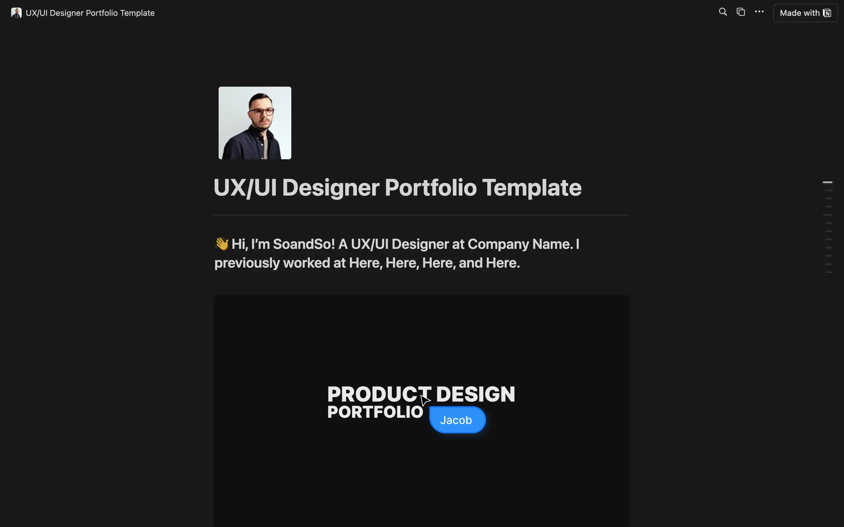 No portfolio would be complete without recommendations. This template pulls in glowing reviews from previous managers and colleagues directly from LinkedIn. These social proofs help validate the designer’s skills and work ethic for prospective clients or hiring managers.